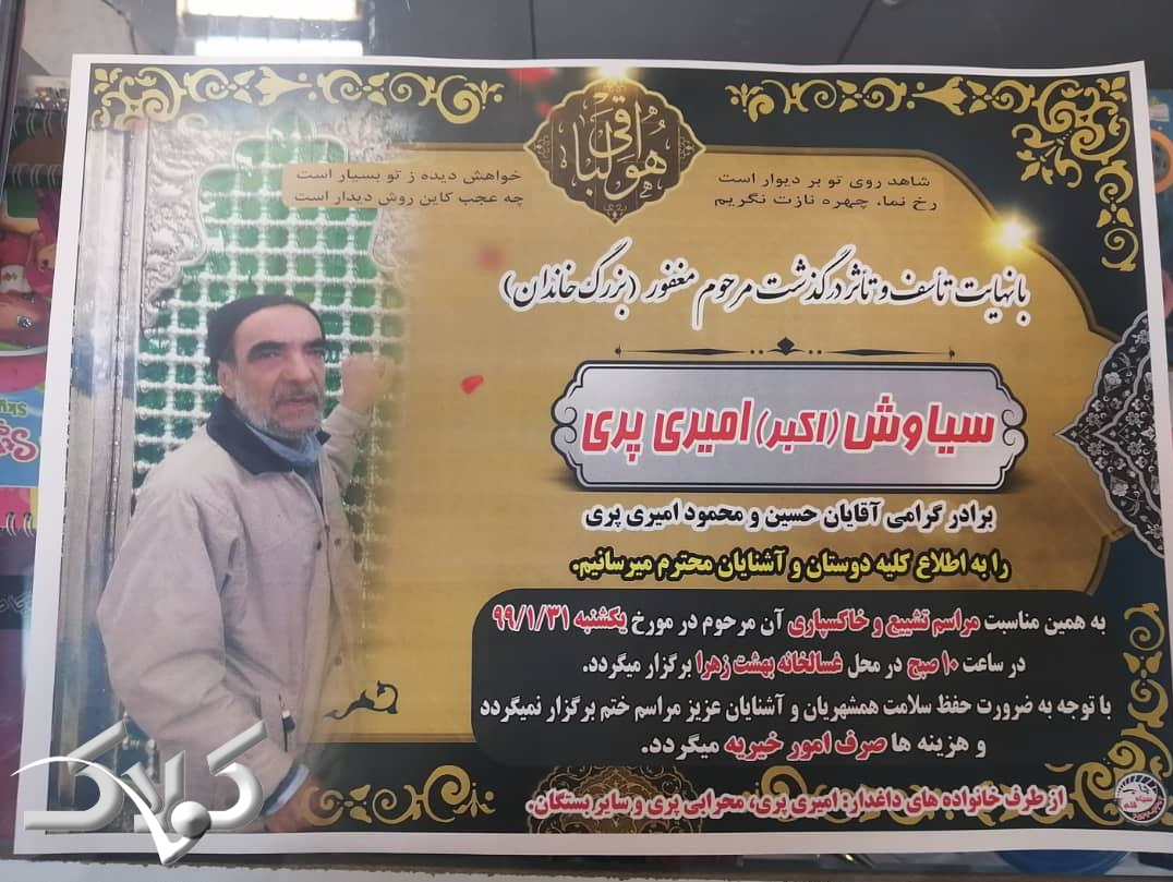 مراسم تشییع و خاکسپاری مرحوم سیاوش (اکبر) امیری پری، امروز (یکشنبه ۳۱ فروردین) برگزار شد. با توجه به ضرورت حفظ سلامت آشنایان، مراسم ختم این شاعر برگزار نمیشود و هزینهها صرف امور خیریه خواهد شد.